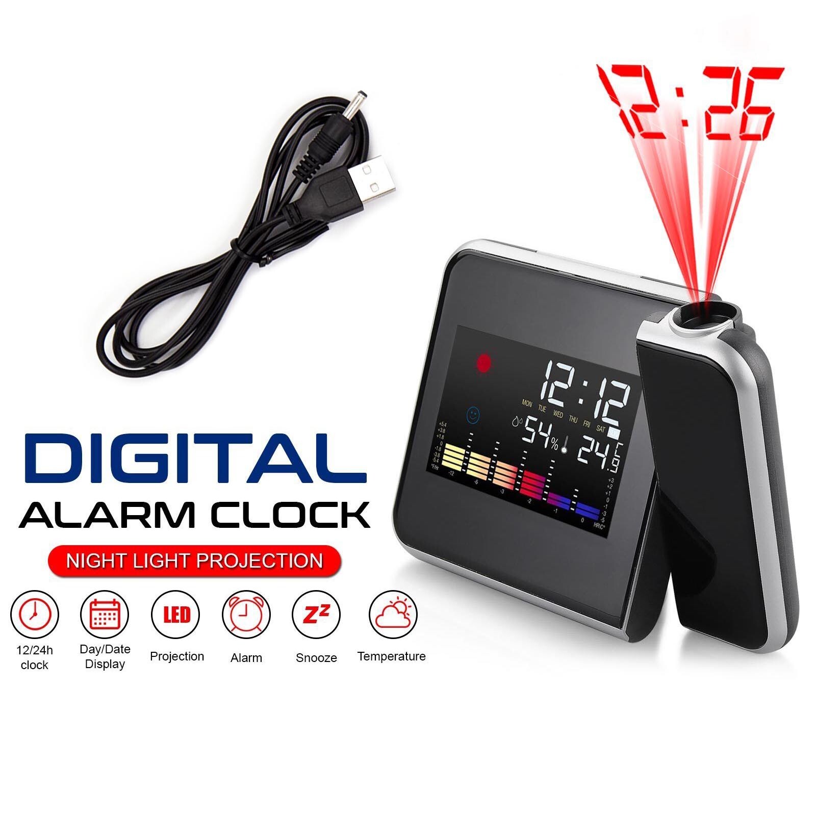 LED Digital Projection Alarm Clock Thermometer Weather Calendar Backlight
