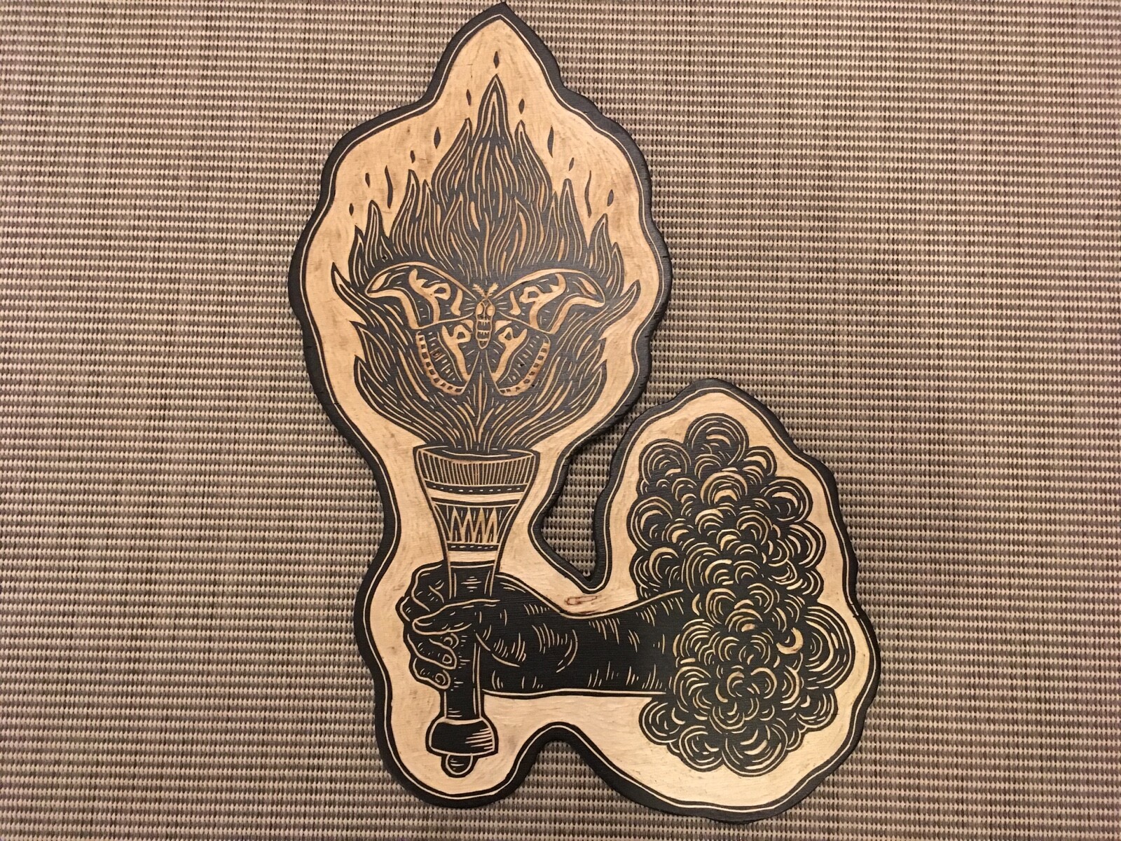 Like A Moth To A Flame Woodcut Wall Sculpture, Bohemian, Occult, Pagan, Art 23″